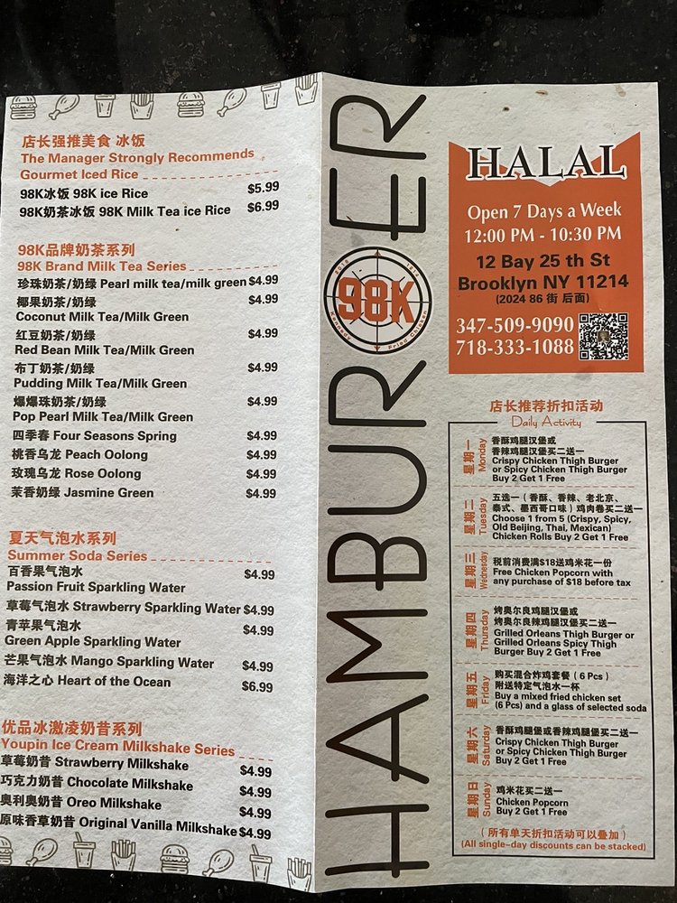 Introducing the menu at 98 K Hamburger, a vibrant burger joint located at 12 Bay 25th St in Brooklyn, NY, promises a delightful gastronomic journey. Specializing in a range of burgers, from the Black Pepper Grilled Chicken and Cheese Beef Burgers to unique offerings like the Grilled Pineapple variations, there’s a savory option for everyone. Customers rave about the juicy chicken thigh burgers, likening them to the phenomenal offerings of KFC in China, resulting in a tantalizing blend of flavors that keeps patrons returning.